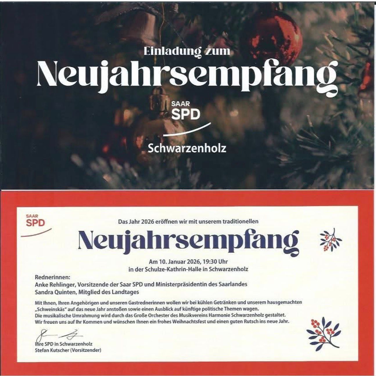 Zum traditionellen Neujahrsempfang der SPD Schwarzenholz laden wir Sie herzlich ein und freuen uns besonders, dass Anke Rehlinger, Ministerpräsidentin des Saarlandes, an diesem Abend zu uns sprechen wird.