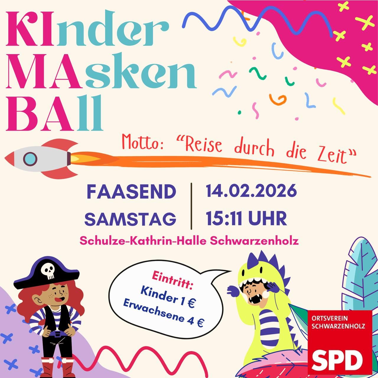 Der SPD Ortsverein Schwarzenholz lädt alle Kinder, Eltern, Freunde und Bekannte an Faasendsamstag, den 14.02.2026, ab 15:11 Uhr herzlich in die Schulze-Kathrin-Halle zu ihrem traditionellen KIMABA ein. Das diesjährige Motto des KIMABA lautet: Reise durch die Zeit! Egal, ob als Dinosaurier, Prinzessin, Ritter oder Cowboy – alle sind willkommen. Für die schönsten Kostüme der Kinder und der Eltern gibt es tolle Preise zu gewinnen.