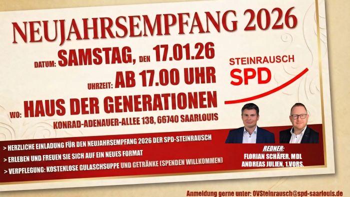 Steinrausch: Der SPD-Ortsverein Steinrausch lädt alle Mitglieder, Freunde und Interessierten herzlich zu einer abwechslungsreichen Tagesfahrt am Samstag, 16. Mai 2026, in den ältesten Weinort Deutschlands, Neumagen-Dhron, ein. Auf dem Programm stehen Weinbau, Kultur und Landschaft – ein Tag zum Entdecken, Genießen und gemeinsamen Erleben.
